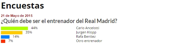 Sin embargo, la mayoría de los lectores de Libertad Digital no piensa así. A través de una encuesta publicada en este periódico desde las 12:00 horas del pasado jueves, bajo el título '¿Quién debe ser el entrenador del Real Madrid?', un 44 por ciento de los lectores considera que Ancelotti debe seguir en el club.