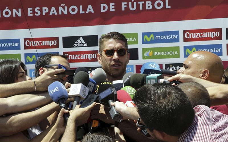 Sergio Ramos departió durante unos minutos con los medios de comunicación a su llegada a la concentración de la selección española en su sede de Las Rozas.