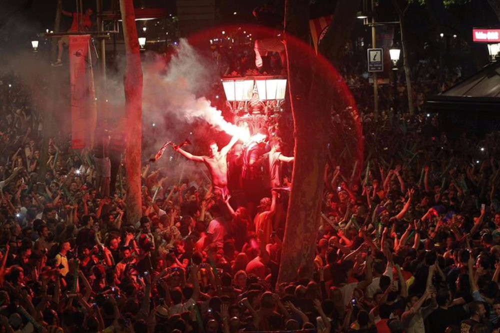 El nuevo triplete azulgrana desbordó la euforia de los seguidores en el centro de Barcelona, donde los cánticos de apoyo al equipo catalán han prevalecido por los típicos de mofa a sus rivales madridistas.