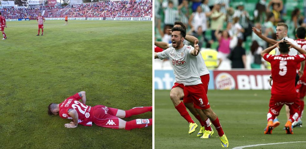 Las cuentas eran claras. Si el Girona ganaba al Lugo en casa estaba en Primera. Si empataba, el Sporting de Gijón necesitaba ganar por dos goles al Betis para superar al conjunto gerundense. La segunda opción fue la que finalmente se hizo real y lo hizo con polémica, con tensión y con botellazo incluido.