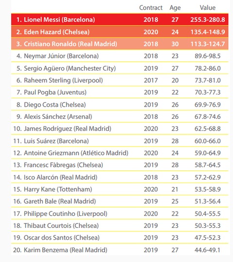 De los 20 primeros jugadores de la lista, 19 son futbolistas que militan en la Liga española o la Premier League. La única excepción es Paul Pogba, centrocampista francés de la Juventus, que figura en la séptima posición, mientras que el primer jugador internacional español es Diego Costa, octavo.