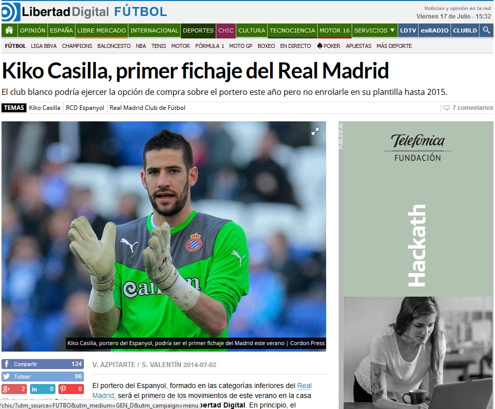La noticia fue públicada el 2 de julio del 2014 y en ella Libertad Digital también informaba del interés del Real Madrid en fichar a Keylor Navas.