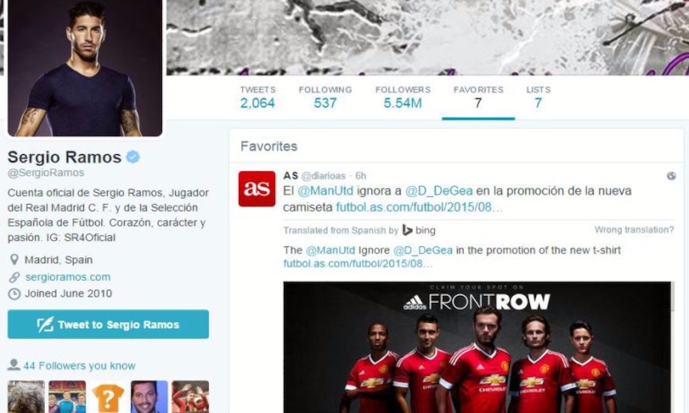Ramos marcó como favorito en su cuenta personal de Twitter, una información del Diario As, en la que se atribuía la ausencia del portero internacional español en la promoción de las nuevas equipaciones del United para la temporada 2015/16, como un más que posible indicativo de que su llegada al Real Madrid está cada vez más cerca.