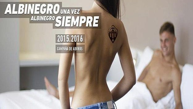 En la imagen, el capitán del equipo, Guille Vázquez, aparece en la cama de un dormitorio envuelto en una sábana con la mirada fija en una joven cuya espalda aparece desnuda con el escudo del Castellón tatuado y bajo el lema de la campaña de abonos, "ALBINEGRO una vez, albinegro SIEMPRE".