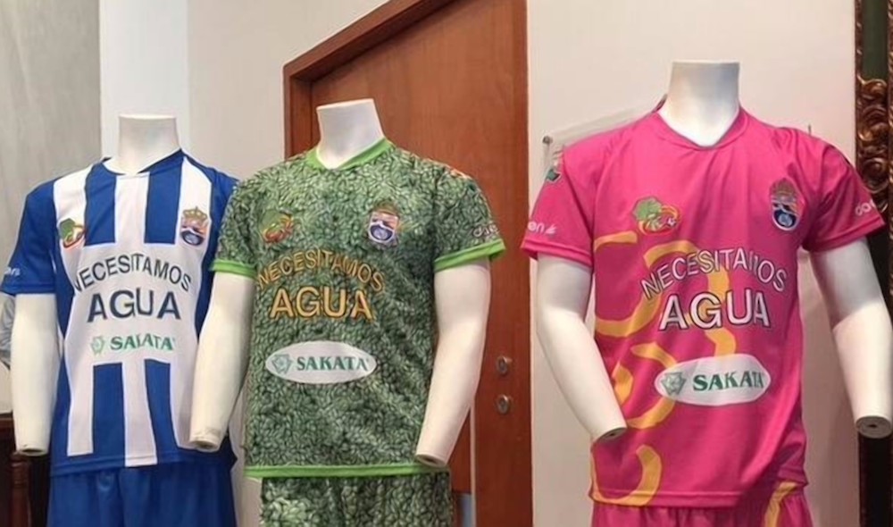 Y por último, está La Hoya de Lorca, también murcianos pero en la categoría de Segunda División B. Y sí en las anteriores camisetas estaban ligadas a temas más banales como la comida o festejos, este equipo ha querido ser más reivindicativo y promocionar en su indumentaria un gran problema que sufre la Región de Murcia: la falta de agua.