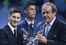 Leo Messi recibe el trofeo de manos de Michel Platini. | EFE
