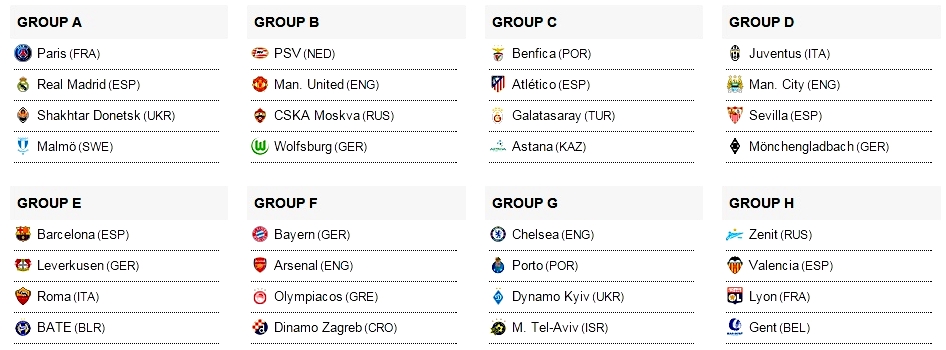 Los equipos españoles han salido bien parados en líneas generales del sorteo de la fase de grupos de la Liga de Campeones, celebrado este jueves en Mónaco. Así, Real Madrid, FC Barcelona, Atlético y Valencia tendrán grupos asequibles en sus respectivos caminos hacia octavos de final. La excepción la pone el Sevilla, que tendrá rivales durísimos en el grupo D como la Juventus de Turín -actual subcampeón de Europa-, el Manchester City de Manuel Pellegrini o el Borussia Monchengladbach alemán.