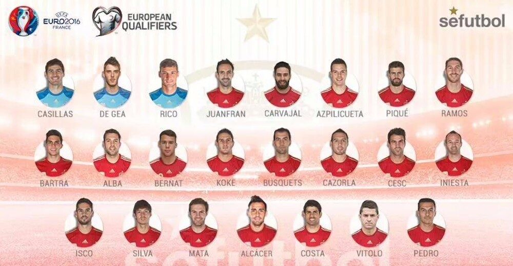 Delanteros: Paco Alcácer (Valencia), Diego Costa (Chelsea/ING), Pedro Rodríguez (Chelsea/ING) y David Silva (Manchester City/ING).