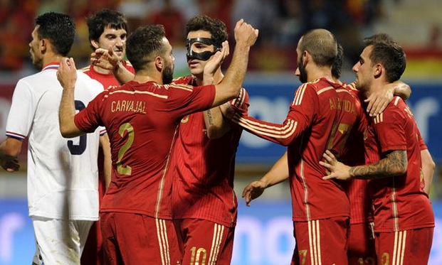 Del Bosque apuesta por: Casillas; Juanfran, Piqué, Ramos, Jordi Alba; Busquets, Iniesta, Cesc; Silva, Pedro y Diego Costa.