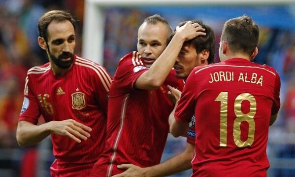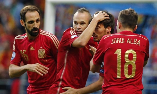 España, 2: Casillas; Juanfran, Piqué, Sergio Ramos, Jordi Alba; Busquets, Iniesta (Koke , m.85), Cesc Fábregas (Cazorla, m.67); Silva, Pedro y Diego Costa (Paco Alcácer, m.75)