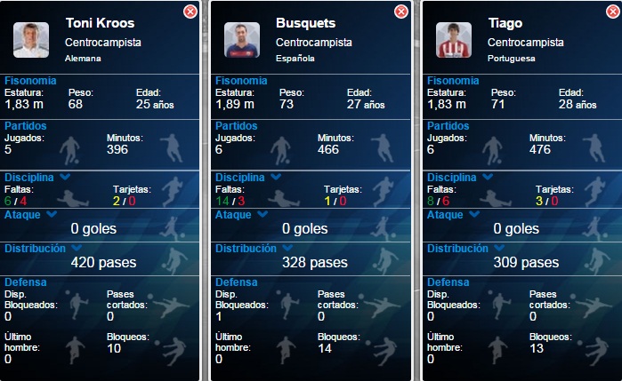 Ofensivamente o en la construcción de jugadas, Kroos no tiene nada que envidiar a los otros dos. Más bien lo contrario. En menos minutos, ha dado más pases. Entonces, ¿es en la defensa dónde Kroos destaca negativamente? Pues tampoco. Hasta la fecha, el jugador del Real Madrid ha realizado 37 recuperaciones, Sergio Busquets, 30 y Tiago, 37.