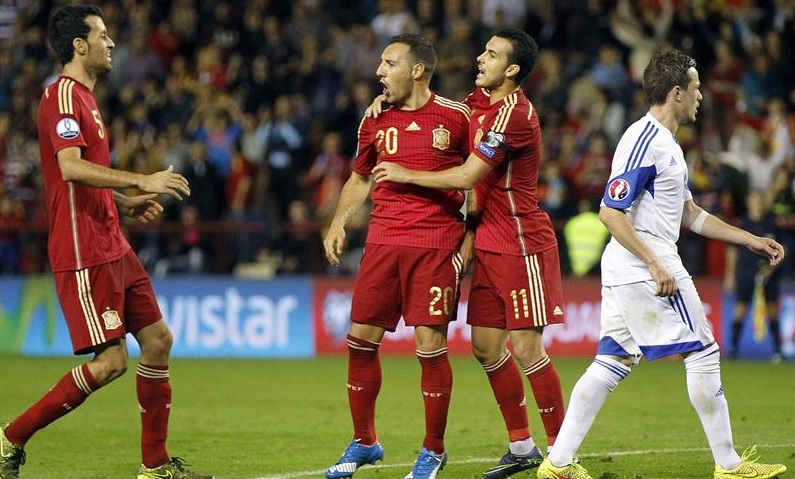 España, 4: Casillas; Juanfran, Bartra, Piqué, Jordi Alba; Busquets, Cazorla, Cesc Fábregas; Silva (Mata, m.10), Pedro (Nolito, m.77) y Morata (Paco Alcácer, m.33)