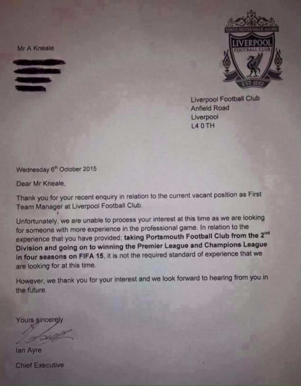 Tras la destitución de Brendan Rogers como técnico del Liverpool, un seguidor se ofreció a dirigir al equipo inglés y el propio club le contestó a través de una carta. ¿Qué expediente tenía el aficionado en cuestión? Pues haber ascendido al Portsmouth a la primera división, haber ganado la Liga de Inglaterra y haber llevado a lo más alto al club, al ganar la Champions League. Méritos de sobra, si no fuera porque esto lo consiguió con el videojuego FIFA 15.
