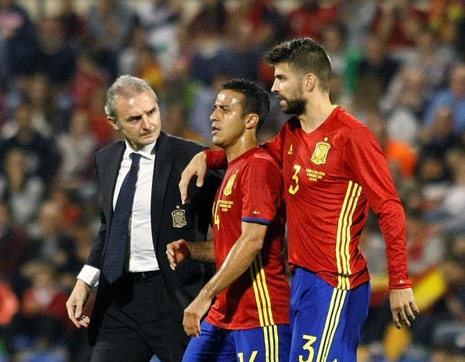 Thiago fue reemplazado a los 27 minutos por Santi Cazorla, del Arsenal. Esta mañana fue sometido a pruebas en la clínica Sanitas La Moraleja de Madrid, donde se le efectuó una resonancia magnética, según informa la página de las selecciones españolas.