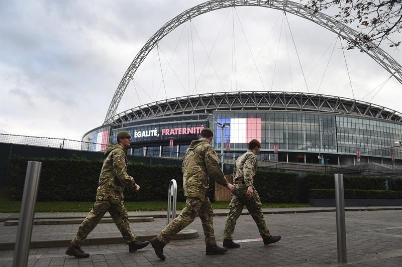 El ejército inglés vigila que no ocurra nada en el estadio horas antes de que se dispute el partido.