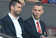 Víctor Valdés, viendo un partido con De Gea en la grada. | Cordon Press/Archivo