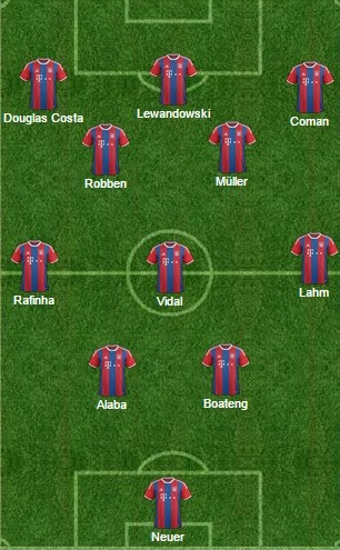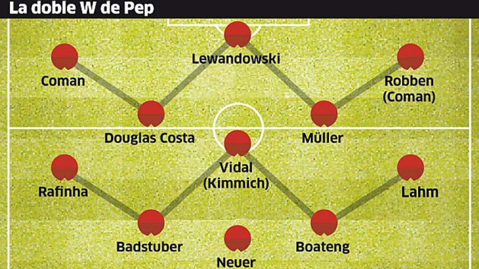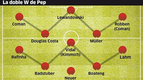 La composición táctica de el equipo tuvo el aroma que más le gusta a Guardiola. Disfrazó a algunos futbolistas en posiciones que no son las suyas. La distribución de los cinco delanteros tuvo a Kingsley Coman como extremo izquierdo y Arjen Robben por la derecha. Robert Lewandowski delantero centro y Douglas Costa con Thomas Müller unos metros más atrás. El chileno Arturo Vidal fue el único centrocampista dedicado a la contención.