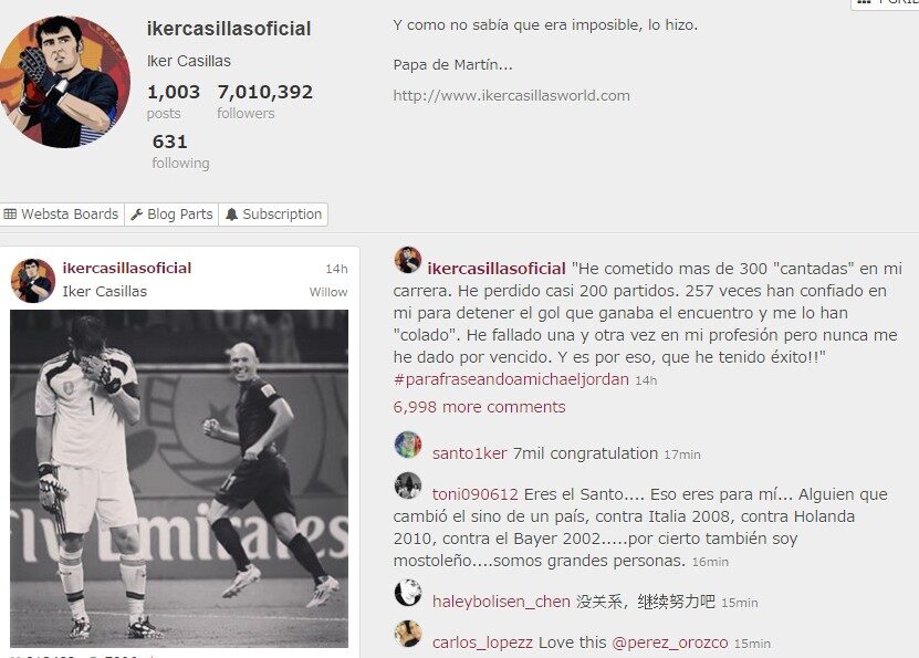 "He cometido más de 300 cantadas en mi carrera. He perdido casi 200 partidos. 257 veces han confiado en mí para detener el gol que ganaba el encuentro y me lo han colado. He fallado una y otra vez en mi profesión pero nunca me he dado por vencido. Y es por eso, que ¡¡he tenido éxito!!", escribió Casillas en su cuenta de Instagram.
