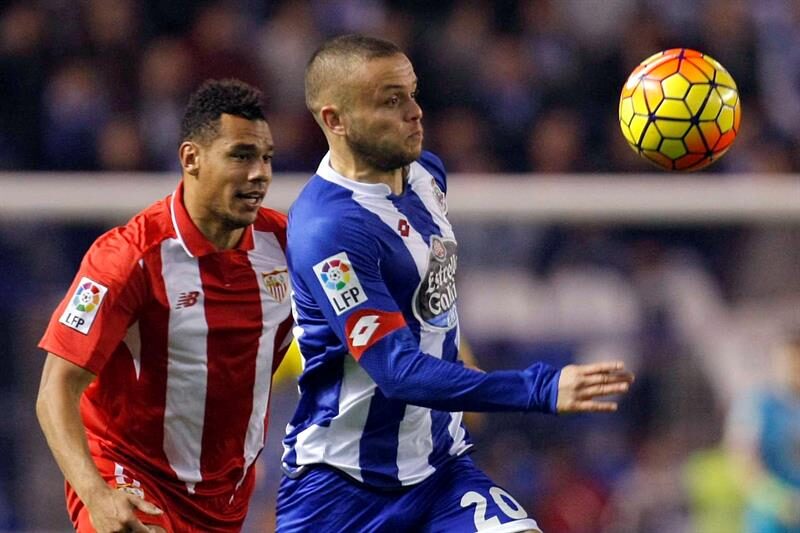 El equipo coruñés dominaba el marcador ante el Sevilla pero no fue capaz de bajar el ritmo del partido a sus intereses y el Sevilla estuvo a punto de equilibrarlo a la media hora con un centro de Gameiro que Konoplyanka remató con una chilena casi imposible que se fue fuera por poco.