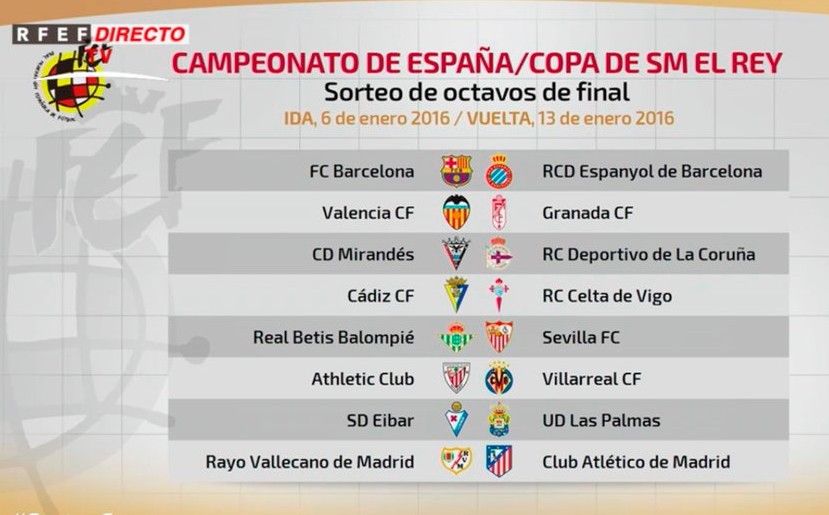 Además, el Valencia se enfrentará al Granada, con el partido de vuelta en el Nuevo Los Cármenes, mientras que el Eibar se las verá con Las Palmas y el Deportivo de La Coruña con el Mirandés, único equipo de la Liga Adelante que se ha metido en la ronda de los dieciséis mejores tras superar al Málaga.