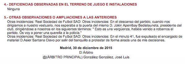Según reflejó el acta arbitral, el presidente de la Real Sociedad bajó al vestuario al descanso para protestar y se dirigió airadamente al propio González González. "Esto es una vergüenza, habéis venido a robarnos el partido. Os voy a poner una querella", fue lo que, según el acta, le gritó Aperribay al colegiado.