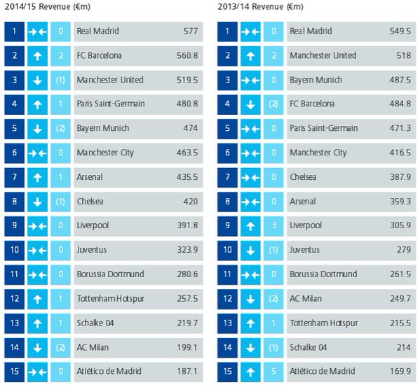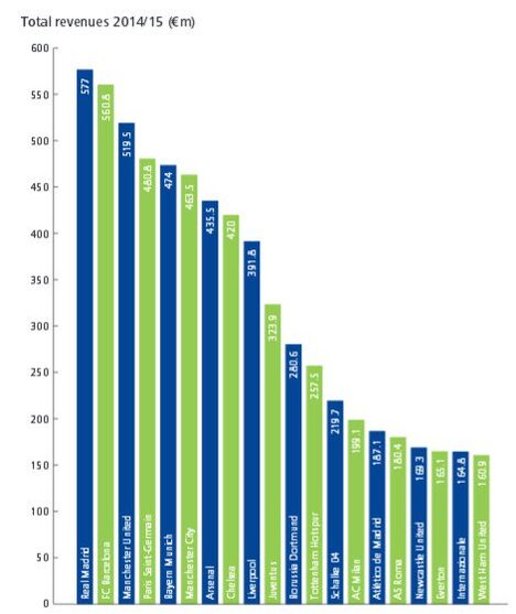 Deloitte indica que los 20 clubes europeos con mayor facturación han generado ingresos superiores a los 6.600 millones de euros, un 8% más que la temporada anterior y prevén un salto sustantivo para la temporada actual. Creen que se superará los 7.000 millones y en la 2016/17, consideran que el crecimiento supondrá ingresos de 8.000 millones de euros gracias a los nuevos contratos televisivos.