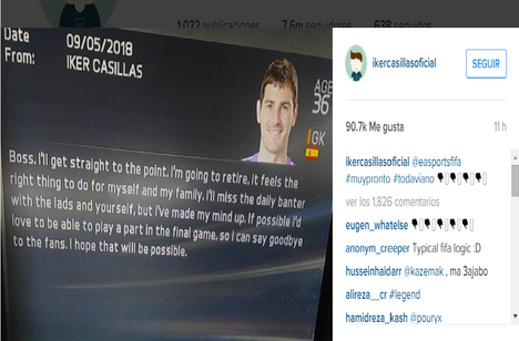 Casillas, que no se encuentra en el mejor momento de su carrera deportiva, parece haber encajado con humor la 'noticia', ya que ha sido el propio jugador, el que ha contestado a través de las redes sociales ( colgando él la propia foto), a la conclusión a la que han llegado los creadores del juego con un: "muy pronto", "todavía no".