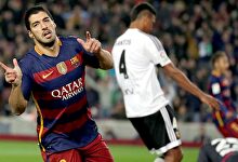 Luis Suárez celebra uno de sus cuatro goles al Valencia. | EFE