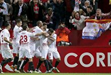 Los jugadores del Sevilla celebran el primero de los dos goles de Kevin Gameiro al Celta. | EFE