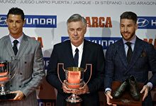 Cristiano Ronaldo, con Ancelotti y Ramos en la gala de Marca. | EFE