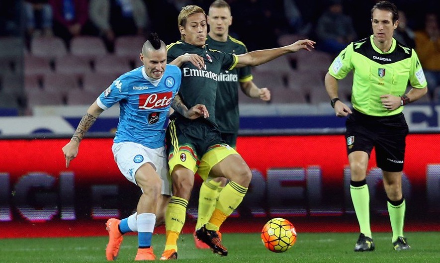 Tras una primera media hora muy igualada y jugada con ritmos bajos, el Nápoles logró adelantarse con una derecha de Lorenzo Insigne desviada por Ignazio Abate, que sorprendió al arquero (m. 39). Sin embargo, el Milan reaccionó con rapidez y empató el partido antes del descanso gracias Giacomo Bonaventura, que marcó su sexto tanto en Serie A (m. 44).