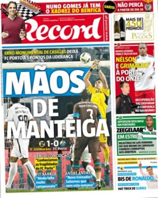 Portada de Record llamando 'Manos de mantequilla' a Iker Casillas. Fue tras su error ante el Vitoria de Guimaraes.