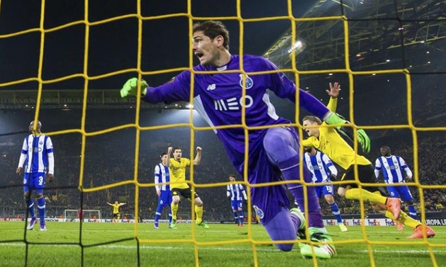 Iker Casillas, tras encajar un gol ante el Borussia Dortmund en la Europa League. Su equipo acabó eliminado.