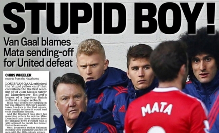 Algunos diarios ingleses han utilizado este adjetivo -"estúpido"- para cargar contra el internacional español y justificar así una nueva derrota del equipo de Manchester, que marcha sexto en la Premier League con 47 puntos, a trece del líder Leicester City. Así, el diario Daily Mail titula este lunes en portada "Stupid Boy" mientras ilustra la información con la mirada asesina que Van Gaal, en el banquillo junto a jugadores como Marouane Fellaini, Guillermo Varela y James Weir, dedicó a Juan Mata.