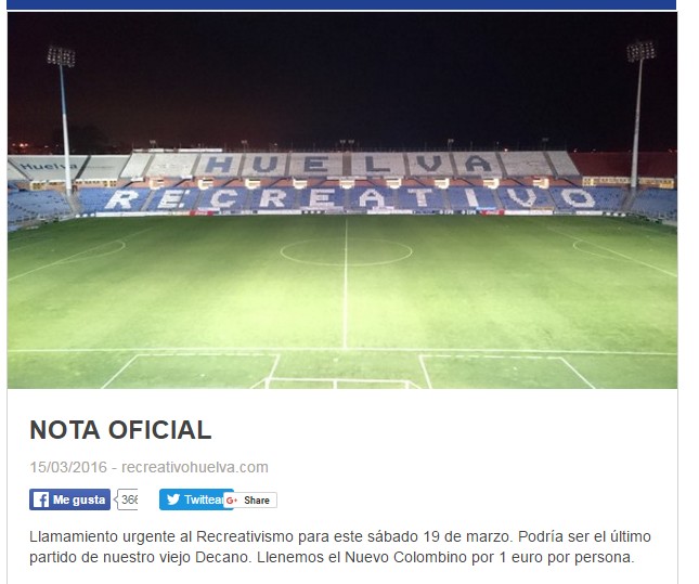 El Recreativo ha emitido un comunicado en el que anuncia que el partido de este sábado ante el Granada B, del grupo IV de Segunda B, "podría ser el último" del Decano, ante la crisis económica e institucional que atraviesa, y por ello ha decidido poner las entradas a un euro para llenar el campo.