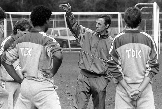 Nada más terminar su etapa como futbolista, continuó su carrera en el Ajax de Amsterdam. Primero como director deportivo y luego como entrenador. Firmó un 6 de juniuo de 1985 y desde el primer día dejó claro su idea futbolistica. Quería un juego ofensivo. Su sistema 3-4-3 sorprendió en Europa y eso que Cruyff no tenía el carnet de entrenador al no haber hecho el pertinente curso.
