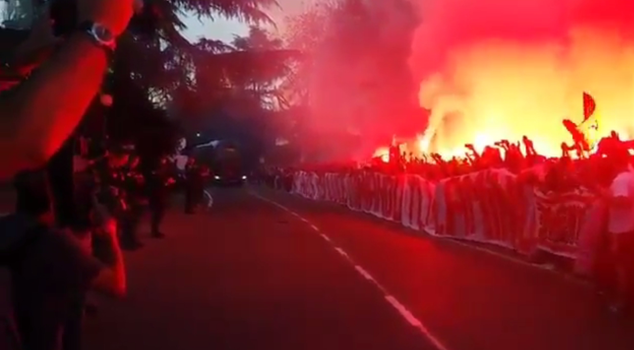 On our club's 113th Birthday the Frente Atletico greeted the team at their hotel with 113 flares! #AtletiBayern pic.twitter.com/D1zPEbklpD