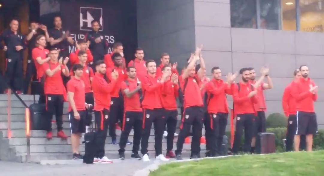 Simeone y su plantilla se emocionaron con el gesto de su afición y al bajar del autobús se quedaron un rato mirando a los aficionados para acabar aplaudiéndoles en un gesto de agradecimiento por su apoyo.