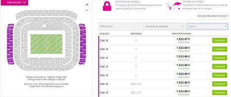 La UEFA estipula por ley que las entradas se dividan en cuatro categorías que se definen por la ubicación de cada una de ellas. La cuarta categoría es la más asequible. Sus precios son de 70 euros. La tercera de 160 euros, la segunda de 320 euros y la primera de 440 euros. Si eres de los primeros socios en escoger categoría, tendrás la opción de elegir cualquier entrada pero si eres de los últimos, quizá sólo puedas ir a Milán adquiriendo una de las entradas más caras.