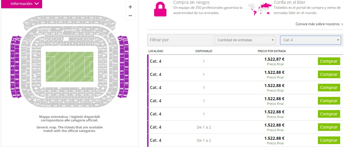 La reventa es un mercado que mueve mucho dinero en la final de la Champions League y que está ya en funcionamiento. Según ticketbis, una entrada en la mejor categoría, cuesta desde 2.647 euros hasta los 13.219. En la categoría más accesible, la número uno, la entrada más barata está en 1522 euros.