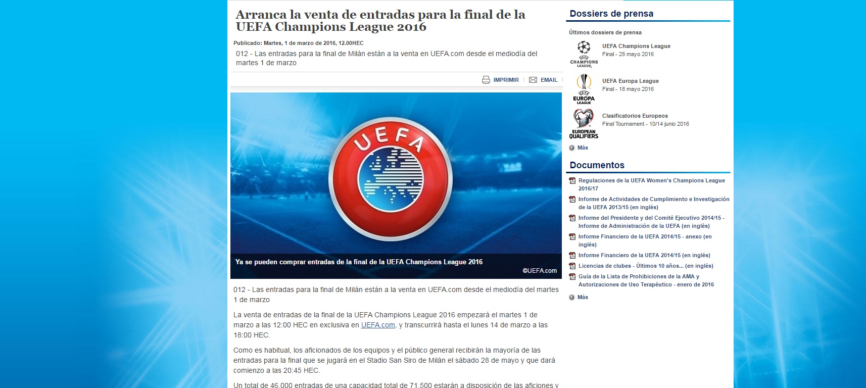No es una novedad porque hace dos años, en Lisboa, Atlético de Madrid y Real Madrid recibieron 17.000 localidades de las 65.647 que tiene el estadio. Es la norma habitual de la UEFA que pone a disposición de los finalistas, tan sólo la mitad de las entradas. Además hay que recordar que de las 20.000 entradas que reciba cada club, no todas irán a disposición de sus socios. El Real Madrid tiene a su vez compromisos con patrocinadores, empleados de club, ex jugadores, familiares de los futbolistas o directivos por ejemplo.