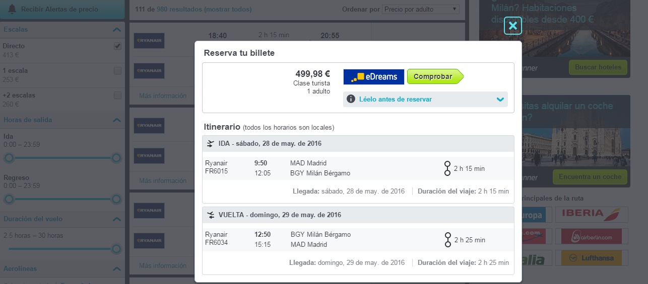 El buscador de vuelos Skyscanner, mantiene ofertas para volar a Milán por menos de 500 euros. Volar el viernes 26 y volver el 29, cuesta 440 euros. La ida el 27 y la vuelta el 29, por 493 y viajar en el mismo día del partido y regresar al día siguiente, todavía está a 500 euros. Estos precios se incrementarán cada día.
