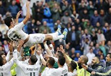 Álvaro Arbeloa, manteado por sus compañeros en el Bernabéu. | EFE