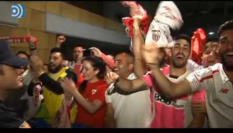El equipo sevillista llegó de madrugada al aeropuerto con la Europa League de la mano de Antonio Reyes ante la euforia de sus aficionados.