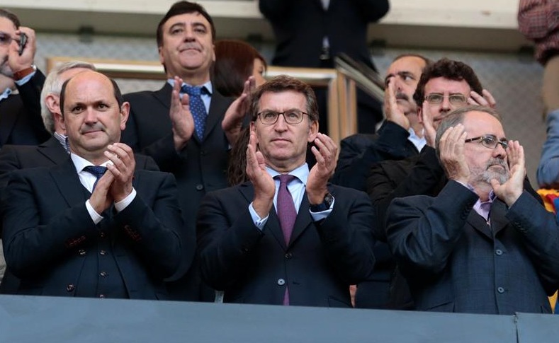 El presidente de la Xunta, Alberto Núñez Feijóo (c), junto a los presidentes de las federaciones gallega, Rafael Louzán (i), y venezolana, Laureano González (d).