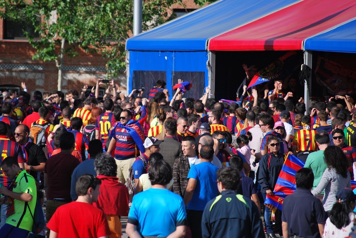 Ambiente festivo entre los aficionados culés en Madrid.