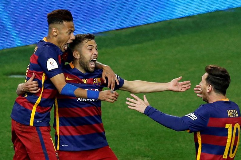 A los ocho minutos de la prórroga, Jordi Alba adelantó a los azulgranas tras aprovechar un excelente pase en largo de Messi. En la imagen, el lateral internacional celebra el 1-0 junto al propio jugador argentino y Neymar.