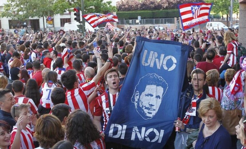 Unos 3.000 aficionados del Atlético de Madrid se concentraron este martes a las puertas del estadio Vicente Calderón para aclamar al equipo, a los jugadores y al entrenador argentino Diego Simeone, al que pidieron que siga al frente del conjunto rojiblanco: "Cholo quédate...".