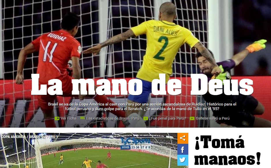 El gol con la mano de Perú que eliminó a Brasil está dando la vuelta al mundo. En muchos países la indignación por un gol ilegal tan evidente es la nota predominante, pero no así en Argentina donde saben sacarle partido a la derrota de su eterno rival.