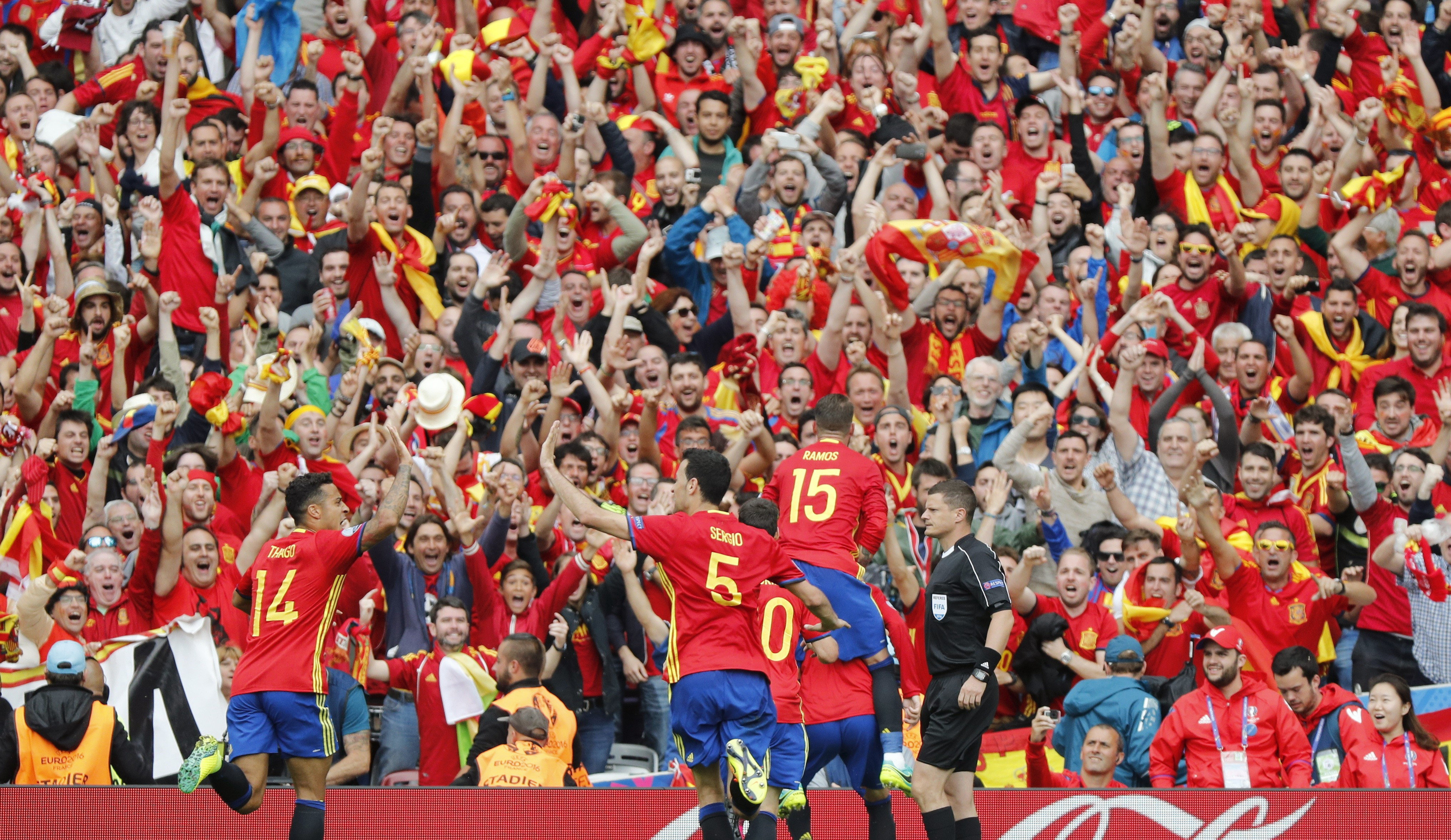 Los jugadores de la selección española y la afición celebran el gol marcado por el defensa de la selección española Gerard Piqué.